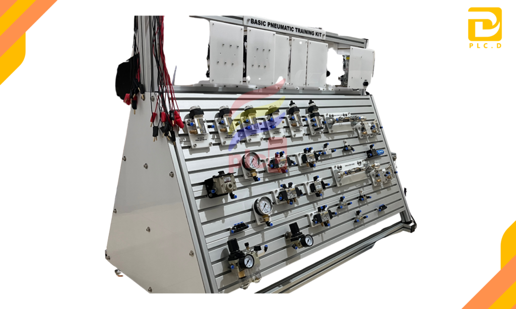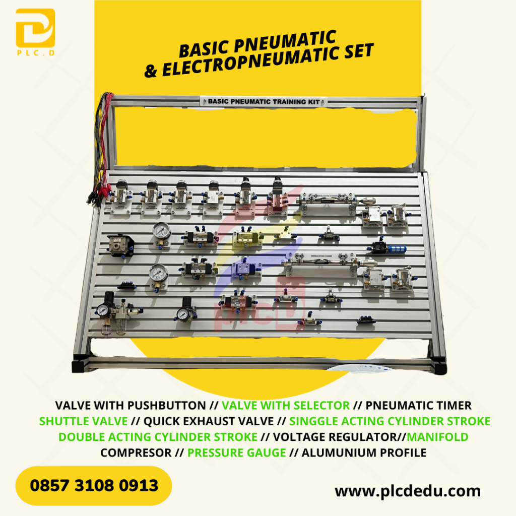 Basic Pneumatic and Electropneumatic Training Kit adalah alat peraga/trainer pendidikan yang dirancang untuk mempelajari dasar-dasar sistem pneumatik manual dan elektro-pneumatik, mulai dari pengaturan arah aliran udara, kontrol kecepatan dan tekanan, hingga integrasi kontrol listrik (sensor, relay, dan solenoid valve) dengan aktuator pneumatik. Trainer ini memungkinkan peserta didik memahami hubungan antara sinyal listrik dan sistem pneumatik yang umum digunakan pada otomasi industri.