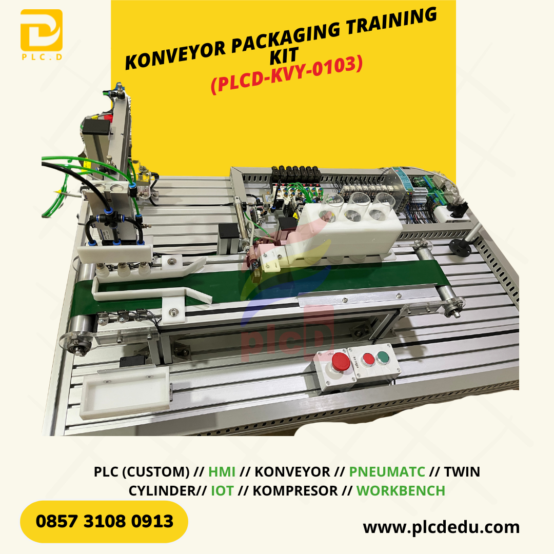 Trainer ini menggunakan PLC dengan 2 Analog Output, HMI touch screen 7 inch, serta terintegrasi dengan SCADA berbasis IoT, sehingga seluruh proses dapat dimonitor dan dikendalikan secara real-time melalui HMI, smartphone, dan website. Sistem konveyor berfungsi sebagai media transportasi barang, sementara mekanisme vakum dan aktuator pneumatik memastikan pemindahan barang berjalan presisi dan aman.
