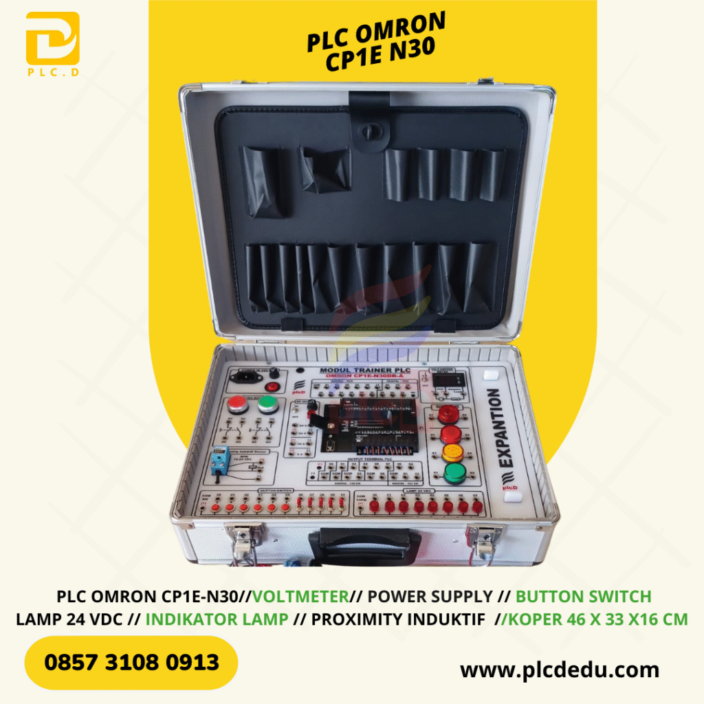 Trainer PLC Omron CP1E-N30 adalah media pembelajaran otomasi industri berbasis PLC Omron seri CP1E tipe N30 yang dikemas dalam bentuk koper portabel oleh PLCD / PT. Datek Inovasi Nusantara. Dibandingkan dengan seri E, tipe N-series memiliki fitur lebih lengkap termasuk dukungan fungsi komunikasi dan instruksi tambahan, sehingga cocok untuk pembelajaran tingkat menengah hingga lanjut.