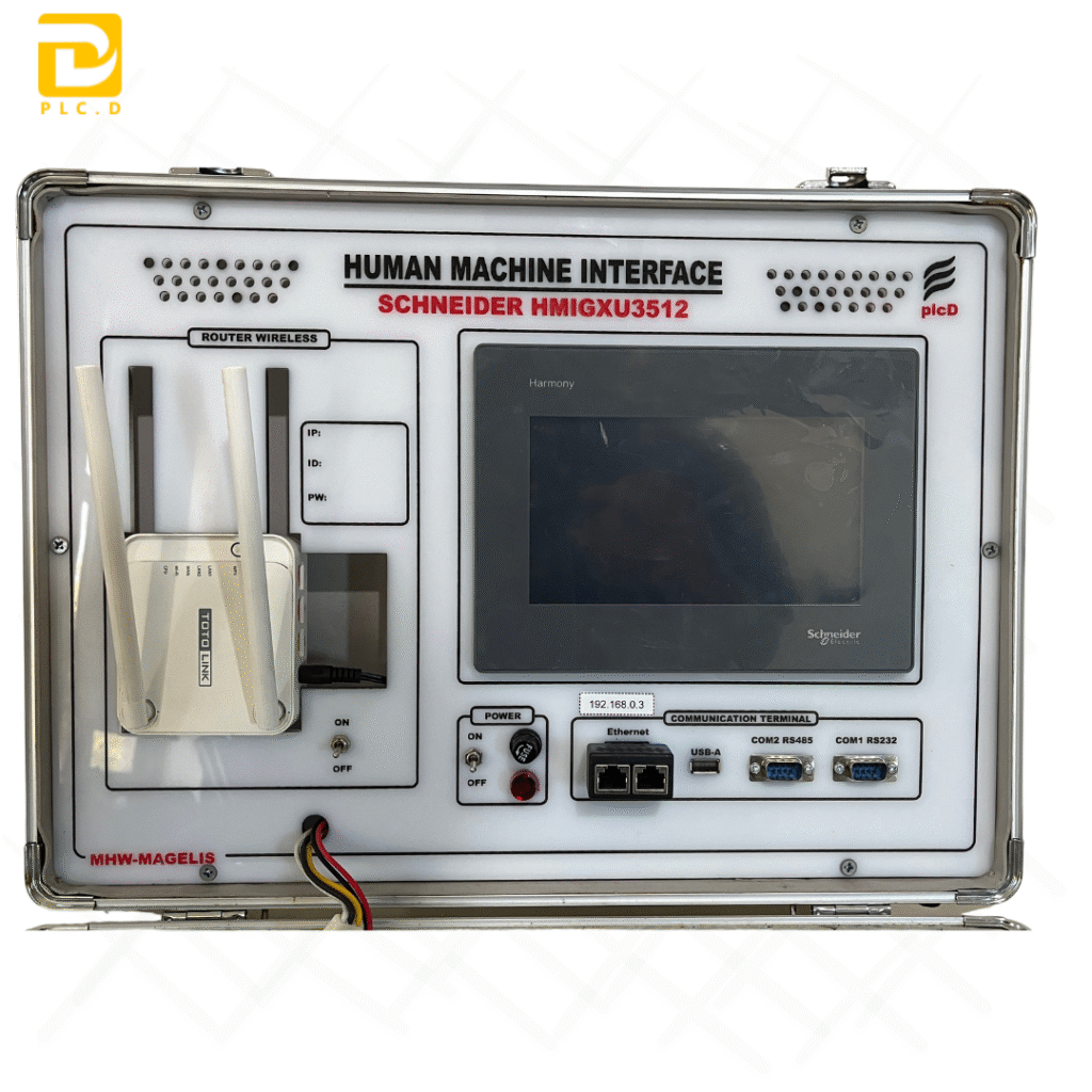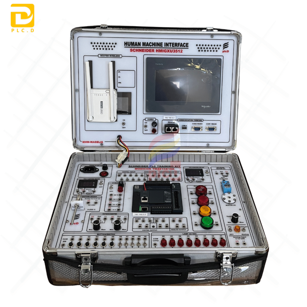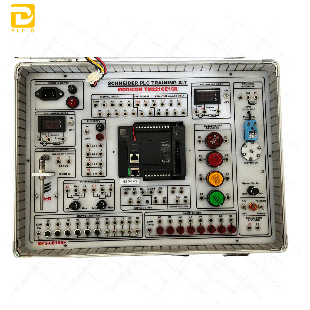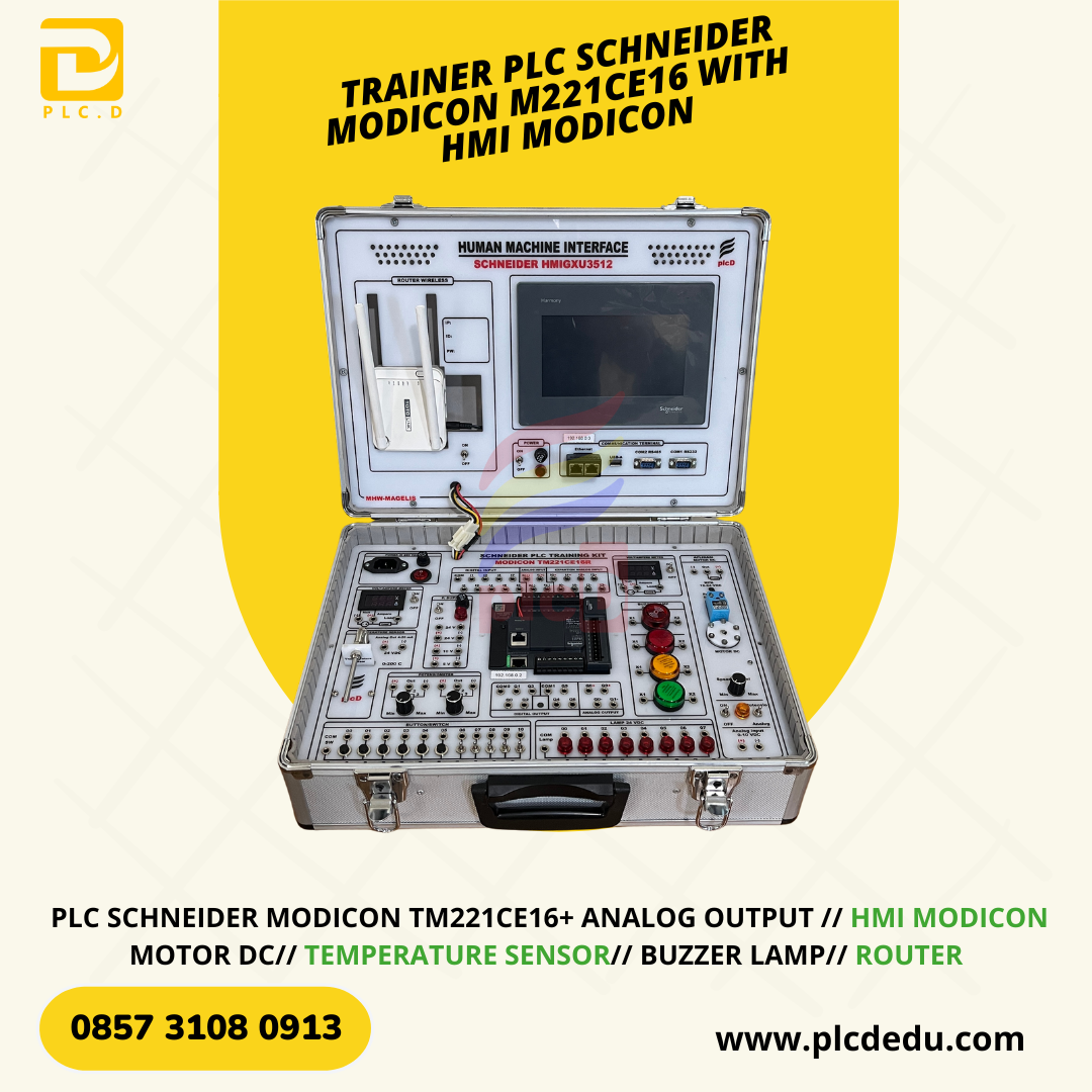 Trainer PLC Schneider Modicon TM221CE16 dengan Analog Output dan HMI Modicon merupakan media pembelajaran otomasi industri yang dirancang oleh PLCD / PT. Datek Inovasi Nusantara dalam bentuk koper portabel yang ringkas, kokoh, dan modern. Trainer ini menggabungkan kontrol digital, analog, serta integrasi visualisasi HMI, sehingga sangat ideal untuk pembelajaran dan pelatihan sistem otomasi berbasis PLC industri.