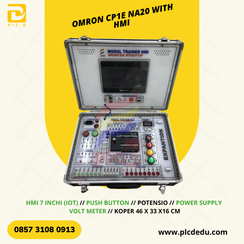 Trainer ini merupakan solusi pembelajaran otomasi industri lengkap, yang menggabungkan PLC Omron CP1E-NA20DR-A dengan HMI Weintek  dalam satu unit portable. Sistem ini memungkinkan pengguna untuk mempelajari pemrograman PLC, komunikasi antar perangkat, serta visualisasi proses melalui antarmuka HMI.