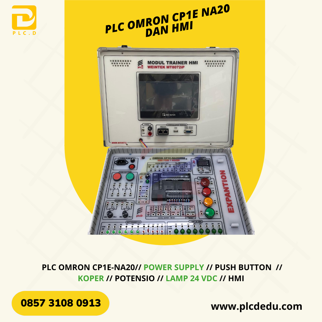 Trainer PLC Omron CP1E-NA20 yang dipadukan dengan HMI Weintek/Weinview 7 inch merupakan media pembelajaran otomasi industri yang lengkap dan praktis. Dikemas dalam bentuk koper portabel oleh PLCD / PT. Datek Inovasi Nusantara, trainer ini sangat cocok untuk mempelajari kontrol digital, analog, dan integrasi HMI sesuai dengan standar industri.