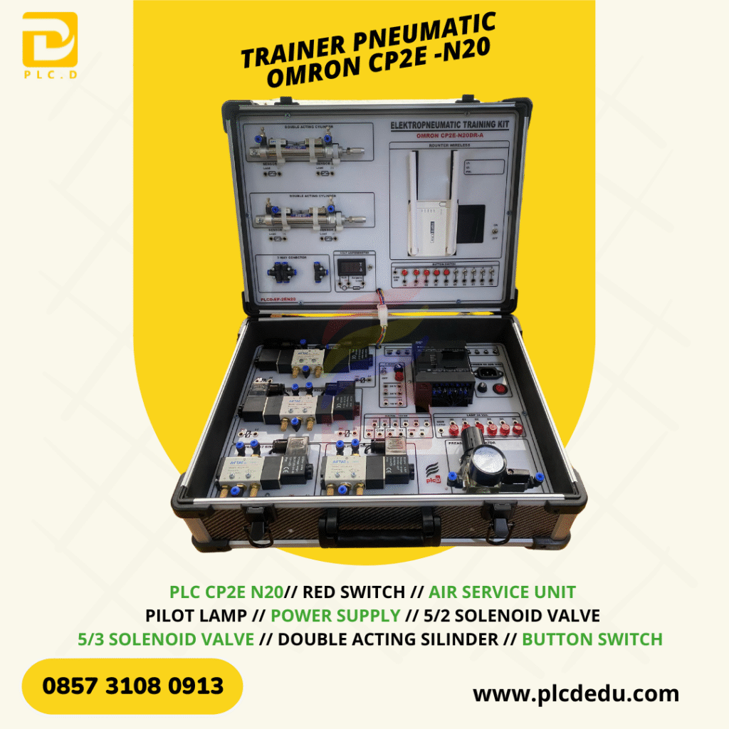 Trainer Pneumatic Omron CP2E-N2O ini dirancang sebagai media pembelajaran sistem kontrol Pneumatic otomatis modern berbasis PLC Omron. Trainer ini menghadirkan lingkungan praktikum yang realistis untuk memahami logika kendali, pemrograman ladder diagram, serta integrasi dengan komponen input/output industri.